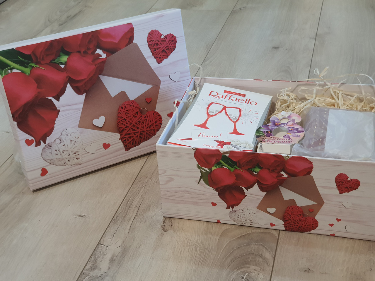 4. Подарункова коробказ наповнювачем та з відкриткою, яку можна по бажанню підписати.